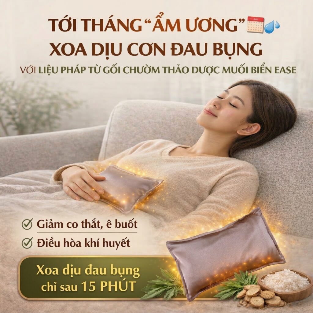 - Chườm ấm bụng trước chu kỳ: Không cần đợi đến khi đau mới chườm. Trước ngày dự kiến hành kinh 2-3 ngày, hãy bắt đầu dùng Gối chườm EASE ủ ấm vùng bụng mỗi tối. Việc này giúp khí huyết lưu thông trước, máu kinh loãng ra, khi đến chu kỳ sẽ tự động thoát ra ngoài nhẹ nhàng mà không cần tử cung phải co bóp mạnh.